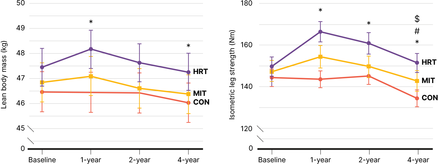 HRT=Heavy resistance training; MIT=Moderate-intensity training; CON=control (no training); * = statistically significant increase compared to baseline; # = greater than with MIT; $ = greater than with CON